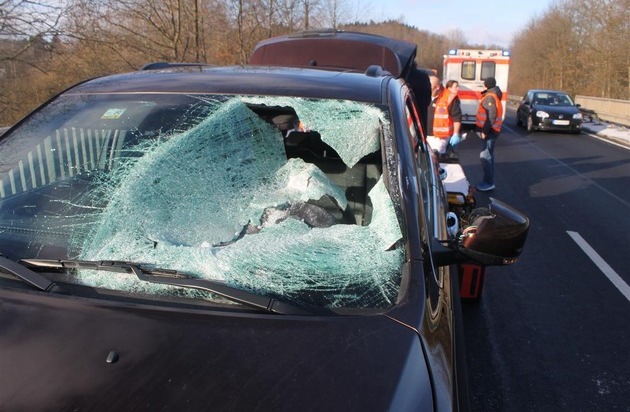 Am Freitag, 06.01.2017, 11:42 Uhr, befuhr ein Sprinter mit Planenaufbau (3,5 Tonnen) die Nistertalstraße L 281 von Hachenburg in Richtung Westerburg. In der Gemarkung Bellingen löste sich nach Zeugenangabe eine etwa 1 x 1 Meter große und 5 cm dicke Eisplatte von der Plane und durchschlug in Teilen die Windschutzscheibe eines entgegenkommenden Pkw. Der 59 jährige Fahrer des Pkw aus der VG Rennerod wurde dabei schwer am Kopf verletzt. Seine Beifahrerin blieb unverletzt. Der Verursacher des Verkehrsunfalls steht fest. Der 59 jährige Verletzte wurde mittels Rettungshubschrauber mit Verdacht auf ein Schädel-Hirn-Trauma in ein Krankenhaus eingeliefert. Die Verletzungen sind nach derzeitigem Kenntnisstand nicht lebensbedrohlich. Die Nistertalstraße musste für Unfallaufnahme und Landung des Rettungshubschraubers für eine Stunde in beide Richtungen voll gesperrt werden. Es entstand ein Sachschaden von etwa 8.000,- Euro. POLIZEIINSPEKTION WESTERBURG - Telefon 02663/9805-0 - E-Mail: piwesterburg@polizei.rlp.de ********************************************************************* ************************************************************