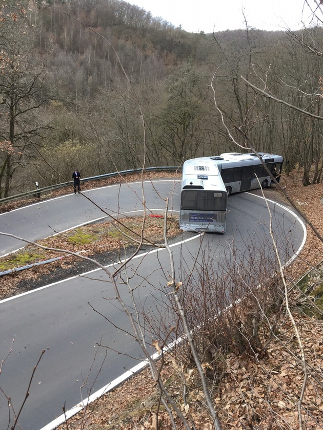 Am 02.03.2017 meldet sich gegen 10:47 Uhr ein Verkehrsteilnehmer und teilt mit, dass sich zwischen den Ortslagen STEINSBERG und GUTENACKER, Kreisstreife 37, KM 0,2 ein Bus festgefahren hätte. Bei der Überprüfung vor Ort konnten die eingesetzten Beamten einen GELENKBUS feststellen der sich in einer engen Linkskurve aufgrund seiner Überlänge (zirka 20 Meter), dort festgefahren hatte. Der aus dem Zulassungsgebiet Aachen stammende Bus sollte in die Nähe von Wiesbaden überführt werden, warum der 47 jährigen Busfahrer aus Mönchengladbach diesen Streckenabschnitt wählte, konnte nicht ermittelt werden. Offensichtlich verließ sich der Fahrer hier ausschließlich auf sein Pkw-Navigationsgerät und übersah mindestens zwei Durchfahrtsverbotsschilder. Der o.g. Streckenabschnitt wurde durch hinzugezogenen Straßenmeisterei Diez in beide Richtungen gesperrt. Die Sperrung dauert derzeit noch an. Der Fahrer wurde vor Ort verwarnt, der Schaden und die Abschleppkosten werden sich auf mind. 5000 Euro belaufen. POLIZEIINSPEKTION DIEZ - Telefon 06432/601-0 - E-Mail: pidiez@polizei.rlp.de ********************************************************************* ************************************************************