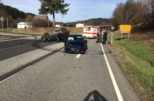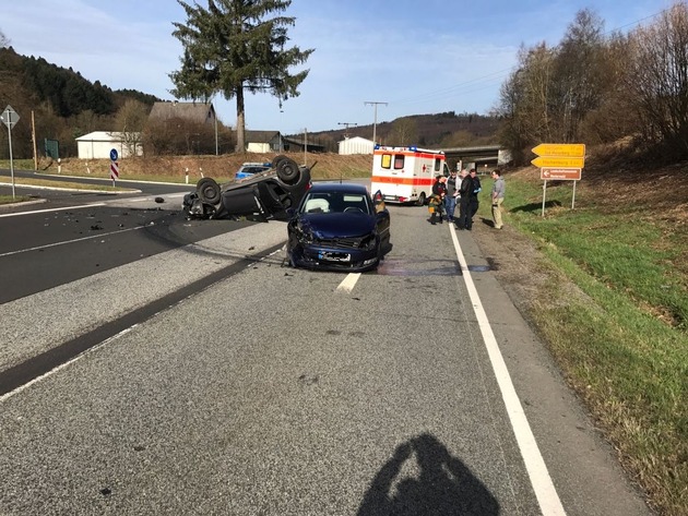 Am 11.03.2017, gegen 09:52 Uhr kam es im Bereich der L281 in der Gemarkung Nister bei Hachenburg zu einem Verkehrsunfall mit Personenschaden. Ein 45-jähriger Fahrzeugführer eines Pkw VW Polo befuhr die L 281 aus Richtung Westerburg in Fahrtrichtung Kroppach und beabsichtigte nach links auf den Zubringer zur L 281/ B 414 abzubiegen. Zur gleichen Zeit befuhr ein 49-jähriger Fahrzeugführer eines Pkw Toyota ebenfalls die L 281, jedoch aus Richtung Kroppach in Fahrtrichtung Westerburg. Beim Abbiegen übersah der 45-Jährige Polofahrer den herannahenden Toyota. Es kam zur Kollision zwischen beiden Fahrzeugen. Hierdurch überschlug sich der PKW Polo, landete auf dem Fahrzeugdach und kam letztendlich auf der Abbiegespur zum Zubringer in Endposition. Der PKW Toyota kam auf der Fahrbahn in Richtung Kroppach mit Fahrzeugfront in Richtung Westerburg zum Stillstand. Beide Unfallbeteiligten erlitten leichte Verletzungen. An den Fahrzeugen entstand Totalschaden mit einer Gesamtschadenshöhe von ca. 12000,-EUR POLIZEIINSPEKTION HACHENBURG - Telefon 02662/9558-0 - E-Mail: pihachenburg@polizei.rlp.de ********************************************************************* ************************************************************
