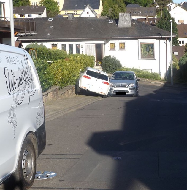 Zu einem ungewöhnlichen Verkehrsunfall kam es am 16.05.2017, gegen 18:15 Uhr, in der Lübener Straße. Ein 20-jähriger PKK-Fahrer aus dem Rhein-Lahn-Kreis stellte sein Auto in der Gefällstrecke ab, vergaß aber offensichtlich, die Handbremse anzuziehen. Das Fahrzeug rollte daher kurz darauf los. Nachdem der führerlose Wagen zunächst einen am Fahrbahnrand geparkten Transporter touchierte, rollte er auf den Gehweg und prallte auf einen ebenfalls geparkten PKW. Schließlich kam das Verursacherfahrzeug auf einer Mauer zum Stillstand. Es entstand ein Sachschaden in niedriger 5-stelliger Höhe. Glücklicherweise wurde bei dem Unfall niemand verletzt. POLIZEIINSPEKTION BAD EMS - Telefon 02603/970-0 - E-Mail: pibadems@polizei.rlp.de ********************************************************************* ************************************************************