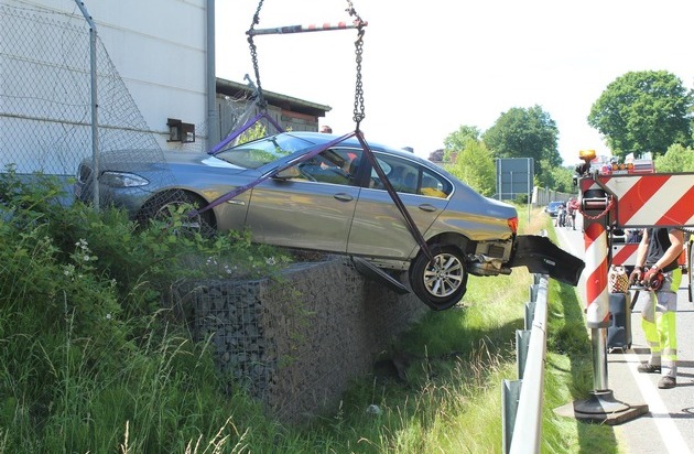 Ein 81-jähriger Pkw-Führer aus Belgien befuhr mit seinem Pkw die Ortsumgehung Höhr-Grenzhausen in Richtung Hillscheid. Wie seine Beifahrerin später schilderte, habe er plötzlich über Unwohlsein geklagt und hierdurch die Kontrolle über sein Fahrzeug verloren. Er überfuhr die ansteigende Schutzplanke und prallte gegen den Zaun und die Gebäudeecke einer ehemaligen Produktionshalle. Das Fahrzeug kam auf einer Begrenzungsmauer in Endlage. Die Feuerwehr Höhr-Grenzhausen war zwecks Bergung der Verletzten und Sicherung des Fahrzeuges im Einsatz. Die beiden Fahrzeuginsassen wurden in ein Krankenhaus eingeliefert. Die L 310 musste zur Bergung der Verletzten und des Fahrzeuges für mehr als eine Stunde voll gesperrt werden. POLIZEIWACHE HÖHR-GRENZHAUSEN - Telefon 02624/9402-0 - E-Mail: pwhoehrgrenzhausen@polizei.rlp.de ********************************************************************* ************************************************************