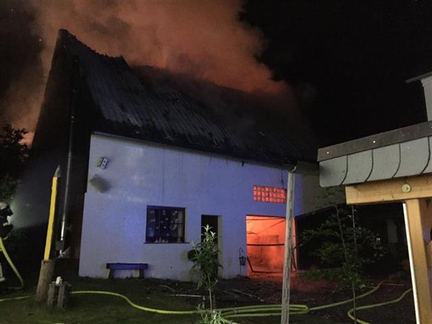 In der Nacht von Samstag, den 24.06.17, auf Sonntag, den 25.07.17, wurde gegen 02:25 Uhr der Vollbrand eines Wohnhauses in Oberrod gemeldet. Vor Ort stellte sich heraus, dass es sich um eine Scheune vom angrenzenden Wohnhaus handelt. Die Feuerwehr hatte bei Eintreffen der Beamten bereits mit den Löscharbeiten begonnen. Zwei Bewohner konnten das Gebäude rechtzeitig verlassen. Ein Zeuge, welcher den Bewohnern zu Hilfe kam, wurde von herabfallenden Teilen leicht verletzt. Als Brandursache könnte eine auf dem Dach installierte Photovoltaik-Anlage in Frage kommen. Die Ermittlungen hierzu dauern noch an. Zur Schadenshöhe können derzeit noch keine genauen Angaben gemacht werden, sie dürfte jedoch im höheren fünfstelligen Bereich liegen. Die Löscharbeiten dauerten bis in die frühen Morgenstunden an. Die Feuerwehren der VGen Rennerod und Westerburg waren mit 65 Kräften im Einsatz.