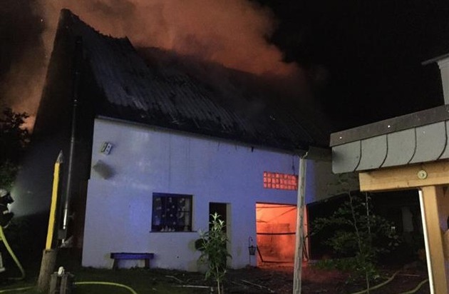 In der Nacht von Samstag, den 24.06.17, auf Sonntag, den 25.07.17, wurde gegen 02:25 Uhr der Vollbrand eines Wohnhauses in Oberrod gemeldet. Vor Ort stellte sich heraus, dass es sich um eine Scheune vom angrenzenden Wohnhaus handelt. Die Feuerwehr hatte bei Eintreffen der Beamten bereits mit den Löscharbeiten begonnen. Zwei Bewohner konnten das Gebäude rechtzeitig verlassen. Ein Zeuge, welcher den Bewohnern zu Hilfe kam, wurde von herabfallenden Teilen leicht verletzt. Als Brandursache könnte eine auf dem Dach installierte Photovoltaik-Anlage in Frage kommen. Die Ermittlungen hierzu dauern noch an. Zur Schadenshöhe können derzeit noch keine genauen Angaben gemacht werden, sie dürfte jedoch im höheren fünfstelligen Bereich liegen. Die Löscharbeiten dauerten bis in die frühen Morgenstunden an. Die Feuerwehren der VGen Rennerod und Westerburg waren mit 65 Kräften im Einsatz.