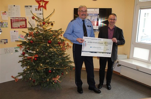 Am 09. September, am Tag der offenen Tür der Polizeiinspektion Diez, hatten interessierte Bürgerinnen und Bürger die Gelegenheit, Einblicke in die polizeiliche Arbeit nehmen und die Dienststelle näher kennen zu lernen. Zahlreiche Besucher wurden gezählt und positive Rückmeldungen erreichten die Diezer Kolleginnen und Kollegen. Aber es wurden nicht nur Besucher gezählt. Es galt auch Spenden für einen guten Zweck zu sammeln. Bereits im Vorfeld hatten sich zahlreiche Sponsoren dazu bereit erklärt, ihren Beitrag zu leisten. Außerdem wurde selbst gebackener Kuchen und Getränke verkauft, der die Kasse zudem füllte. Galt es doch die Lebenshilfe Limburg Diez zu unterstützen, die sich für Menschen mit geistiger und psychischer Behinderung einsetzt und dabei diesen und ihren Angehörigen hilft, ein möglichst normales Leben zu führen. Nachdem alles abgerechnet war, konnte am 19.12.2017 nunmehr die Spendenübergabe in den Räumlichkeiten der Polizeiinspektion Diez erfolgen. Zusammen mit dem Geschäftsführer Werner Schlenz und dem Verantwortlichen für Öffentlichkeitsarbeit, Herrn Korn-Kinkel, konnte der stellvertretende Dienststellenleiter Klaus Laube insgesamt 1.200,- EUR für den guten Zweck überreichen. An dieser Stelle bedankte sich Herr Laube nochmals bei allen Helfern und Sponsoren, dass dieses gute Ergebnis zustande gekommen ist und das Geld nunmehr für behinderte Menschen eingesetzt werden kann. Herr Schlenz betonte die Wichtigkeit solcher Spenden, die das Arbeiten mit den behinderten Menschen erleichtert. Er gab bekannt, dass das Geld für die Modernisierung einer behindertengerechten Toilette in der Diezer Werkstatt vorgesehen ist. Er bedankte sich bei allen, die für die Sache gearbeitet oder gespendet haben und dass die Lebenshilfe Limburg Diez für die Spende ausgewählt worden sei.