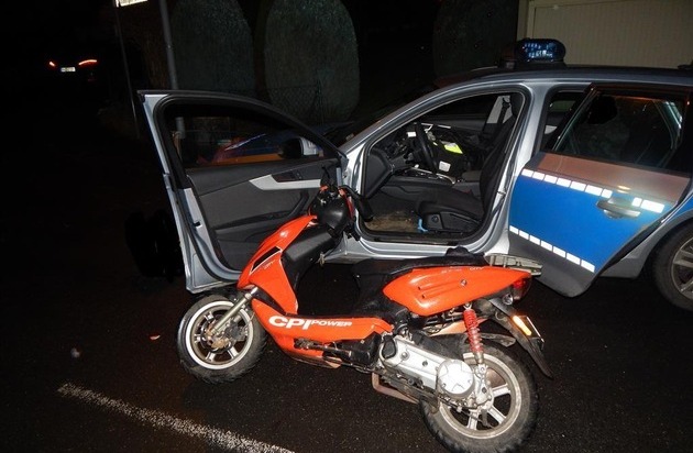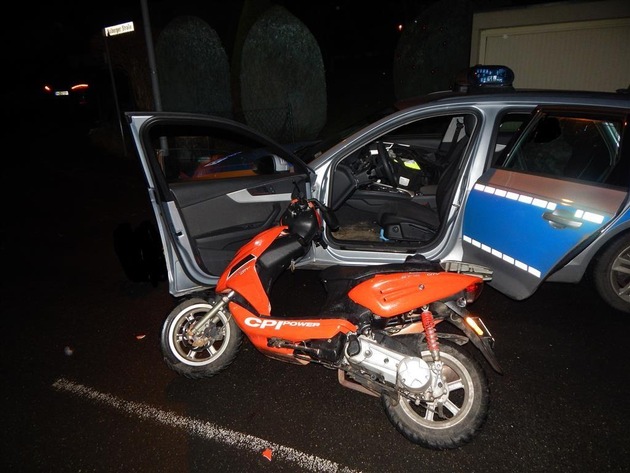 Am Donnerstag (28.12.2017) sollte kurz nach Mitternacht der Fahrer eines Kleinkraftrades in Hahnstätten einer Verkehrskontrolle unterzogen werden. Der Rollerfahrer missachtete die eindeutigen Anhaltezeichen und fuhr mit unverminderter Geschwindigkeit auf den Polizeibeamten zu, welcher sich deutlich sichtbar auf der Straße positioniert hatte. Der Beamte wich zur Seite aus, konnte eine leichte Kollision jedoch nicht verhindern und kam zu Sturz. Dabei zog er sich leichte Verletzungen zu, war aber weiter dienstfähig. Der 43 Jahre alte Mann aus der Verbandsgemeinde Hahnstätten fuhr danach gegen die leicht offen stehende Fahrertür des Streifenwagens und kam ebenfalls zu Fall. An dem Dienst-Kfz entstand ein nicht unerheblicher Sachschaden. Da die Beamten bei dem Rollerfahrer erheblichen Alkoholkonsum feststellten, musste eine Blutprobe entnommen werden. Der Roller wurde durch einen Abschleppdienst abgeholt und sichergestellt; der Streifenwagen war noch bedingt fahrbereit.