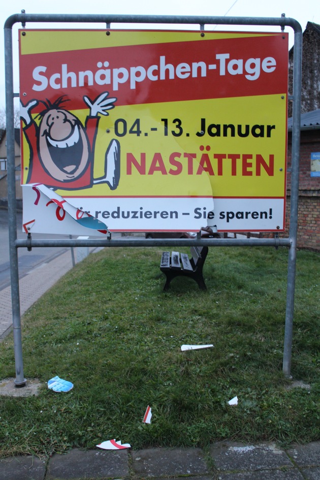 Im Zeitraum vom 13.01.2018, 18:00 Uhr bis zum 14.01.2018, 17:00 Uhr, wurde in der Oberstraße eine Hinweistafel der Stadt Nastätten durch Unbekannte mutwillig beschädigt. Die Polizei St. Goarshausen bittet Personen, die in diesem Zusammenhang etwas beobachtet haben, sich unter der Tel. 06771/93270 zu melden.
