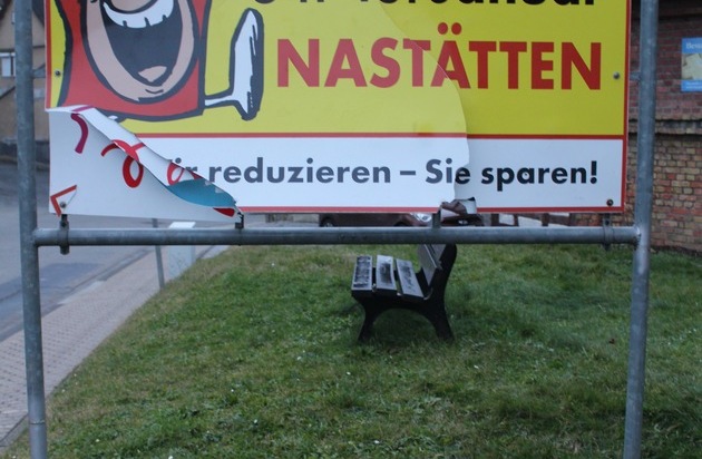 Im Zeitraum vom 13.01.2018, 18:00 Uhr bis zum 14.01.2018, 17:00 Uhr, wurde in der Oberstraße eine Hinweistafel der Stadt Nastätten durch Unbekannte mutwillig beschädigt. Die Polizei St. Goarshausen bittet Personen, die in diesem Zusammenhang etwas beobachtet haben, sich unter der Tel. 06771/93270 zu melden.