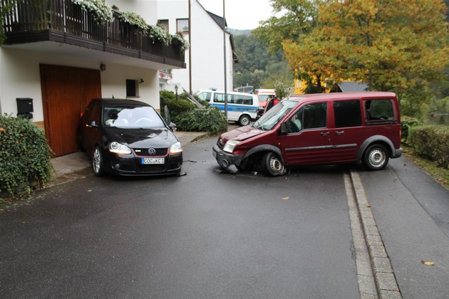 Bei einem Verkehrsunfall im Elztal in Moselkern wurden drei Personen leicht verletzt. Die beiden Autos stießen im Begegnungsverkehr frontal zusammen, ein Pkw wurde dann noch in ein Garagentor geschoben. Alle Beteiligten wohnen in Moselkern; die Fahrzeuge wurden erheblich beschädigt.