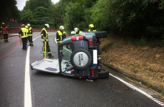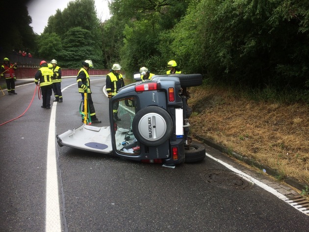 Verkehrsunfall mit Personenschaden Gegen 13 Uhr kam es auf der B257 in Höhe "Bunte Kuh" zu einem Unfall mit Überschlag. Die 26-jährige Fahrzeugführerin verlor anscheinend auf der regennassen Fahrbahn die Kontrolle über ihren Pkw, kam ins Schleudern, überschlug sich und kam auf der Seite liegend zu ihrer Endposition. Sie musste durch die Freiwillige Feuerwehr aus ihrem Pkw befreit werden, indem das Pkw-Dach aufgeschnitten wurde. Der Notarzt sowie die Rettungssanitäter hoben sie anschließend aus dem Pkw heraus und verbrachten sie ins Krankenhaus. Die B257 war während der Einsatzmaßnahmen ca. 1,5 Stunden gesperrt.