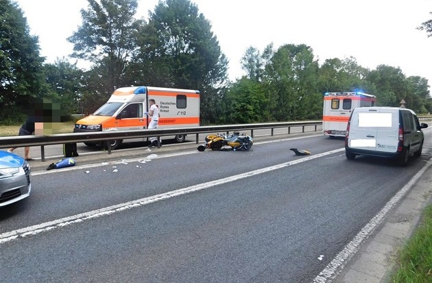 Remagen. Heute Nachmittag kam es zu einem Verkehrsunfall mit einer schwer verletzten Person. Ein 53-jähriger Motorradfahrer befuhr die Anschlussstelle Remagen-Süd in Richtung Koblenz auf und kam dabei ohne Fremdbeteiligung von der trockenen Fahrbahn ab und prallte gegen die Mittelschutzplanke. Der Verletzte wurde mit dem Rettungshubschrauber in ein Koblenzer Krankenhaus geflogen. Für die Dauer der Unfallaufnahme sowie für die Landung des Rettungshubschraubers musste die B 9 zeitweise komplett gesperrt werden. Die FFW Remagen unterstützte die Polizei Remagen mit der Drehleiter.