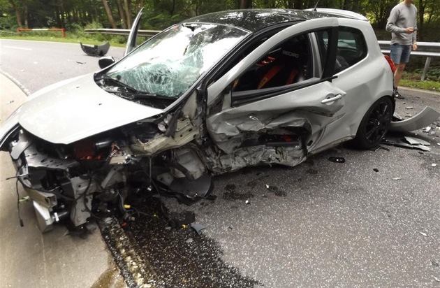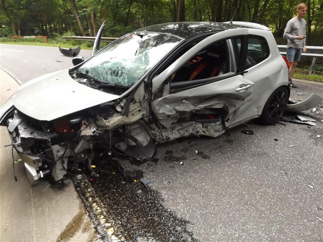 5. Frontalzusammenstoß zweier PKW Am 23.07.2017 gegen 12.15 Uhr befuhr der 33.järige Fahrer eines PKW Porsche die L 10 von der Hohen Acht kommend in Richtung Adenau und stieß mit einem entgegenkommenden PKW Renault Clio seitlich versetzt frontal zusammen. Die Fahrer und der Beifahrer des Renault, sowie der Fahrer des Porsche wurden nur leicht verletzt. Die beiden PKW erlitten Totalschaden; insgesamt ca. 50000 Euro.