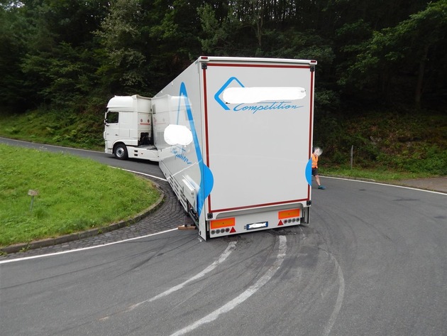 Am Mittwoch, den 02.08.2017, gegen 17:30 Uhr, fuhr sich ein Sattelzug eines Rennteams aus Südtirol (Italien) auf der K 14 zwischen dem Nettetal und dem Ort Langefeld fest. Der Auflieger des Sattelzuges setzte in der ersten Serpentine der kurvenreichen Steigungsstrecke Richtung Langenfeld so auf, dass der Sattelzug weder nach vorne noch zurück fahren konnte. Teile der Karosserie gruben sich in den Fahrbahnbelag ein, so dass ein Schaden am Auflieger sowie an der Fahrbahn entstand. Der Gesamtschaden beläuft sich auf ca. 5.000 EUR. Der Sattelzug musste durch ein Abschleppunternehmen mittels Hebetechnik befreit werden. Es folgten langwierige Rangiermanöver. Die K 14 war bis 19:45 Uhr voll gesperrt. Der Sattelzug, welcher eigentlich von der A 61, Anschlussstelle Wehr, zum Nürburgring fahren wollte, hatte sich auf der Umleitungsstrecke von Wehr kommend im Bereich Weibern verfahren, und war dann von seinem Navigationsgerät über Weibern, Hausten und Langenfeld in Richtung Nürburgring gelotst worden.