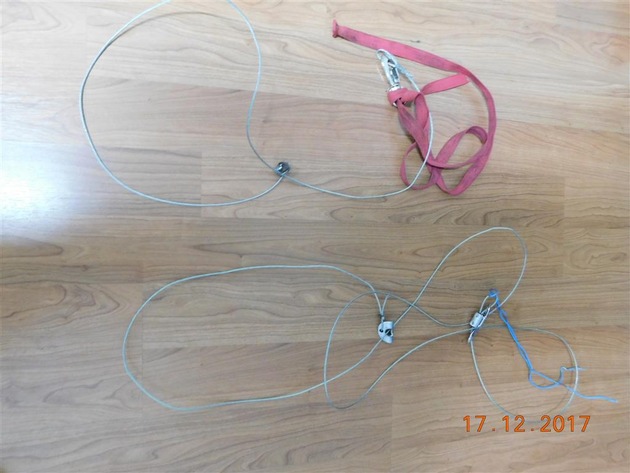 Am Sonntag, den 17.12.2017, gegen 09:50 Uhr, wunderte sich ein 69-jähriger Spaziergänger darüber, dass sein Hund auf einem Sparziergang an der Ortsrandlage von Arft nicht mehr aus einem Gebüsch zurückkehrte. Als er der Spur seines Hundes folgte, fand er diesen, mit dem Schwanz in einer Drahtseilschlinge gefangen, in dem Gebüsch. Eine weitere Drahtseilschlinge konnte er in unmittelbarer Nähe feststellen. Glücklicherweise wurde der Hund nicht verletzt. Die an der Tatörtlichkeit auf dem Boden verstreuten Brotreste lassen darauf schließen, dass ein unbekannter Täter bewusste Wildtiere anlocken wollte, um diese einzufangen. Die Polizei Adenau ermittelt nun wegen des Verdachts der Jagdwilderei gegen den noch unbekannten Täter. Zeugen die sachdienliche Hinweise machen können werden gebeten sich unter 02691/9250 an die Polizeiinspektion Adenau zu wenden.