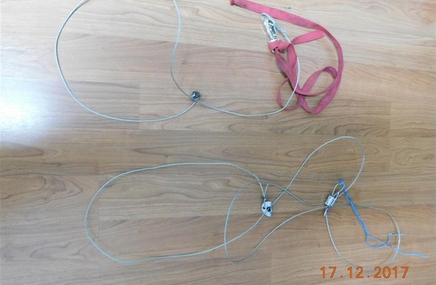 Am Sonntag, den 17.12.2017, gegen 09:50 Uhr, wunderte sich ein 69-jähriger Spaziergänger darüber, dass sein Hund auf einem Sparziergang an der Ortsrandlage von Arft nicht mehr aus einem Gebüsch zurückkehrte. Als er der Spur seines Hundes folgte, fand er diesen, mit dem Schwanz in einer Drahtseilschlinge gefangen, in dem Gebüsch. Eine weitere Drahtseilschlinge konnte er in unmittelbarer Nähe feststellen. Glücklicherweise wurde der Hund nicht verletzt. Die an der Tatörtlichkeit auf dem Boden verstreuten Brotreste lassen darauf schließen, dass ein unbekannter Täter bewusste Wildtiere anlocken wollte, um diese einzufangen. Die Polizei Adenau ermittelt nun wegen des Verdachts der Jagdwilderei gegen den noch unbekannten Täter. Zeugen die sachdienliche Hinweise machen können werden gebeten sich unter 02691/9250 an die Polizeiinspektion Adenau zu wenden.