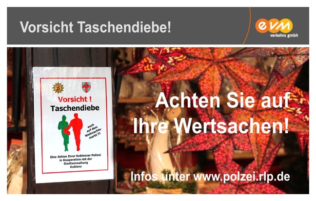 Der Sachbereich 15, Zentrale Prävention des Polizeipräsidiums Koblenz, und die Geschäftsstelle des kriminalpräventiven Rates der Stadt Koblenz (Initiative "Sicherheit in unserer Stadt") haben diese Entwicklung schon 2008 zum Anlass genommen, eine gemeinsame Kampagne gegen Taschendiebstahl zu starten. In diesem Jahr wird die Kampagne über die gesamte Dauer des Weihnachtsmarktes von der Polizei Koblenz zusätzlich auf Facebook und Twitter begleitet. Die Facebook-Seite der Polizei hat bereits ca. 55.000 Follower, täglich werden es mehr. Über die Nutzung der neuen digitalen Medien erhoffen wir weitere Zielgruppen zu erreichen. Auch die EVM unterstützt die Aktion mithilfe der Bildschirmwerbung in ihren Bussen.