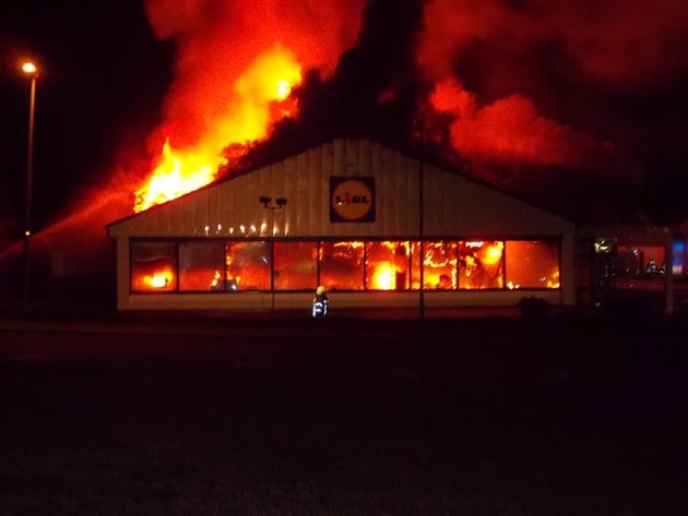 Am 23.11.2016 wurde der PI Simmern um 21.35 Uhr der Brand des LIDL-Marktes in Kastellaun gemeldet. Es wurden sofort Feuerwehr und Polizei zum Einsatzort entsandt. Im Einsatzverlauf wurden neben Feuerwehren der Verbandsgemeinde Kastellaun weitere Wehren aus dem Hunsrück zur Unterstützung nachalarmiert. Stand 0:00 Uhr waren ca. 145 Feuerwehrleute im Einsatz. Es konnte nicht mehr verhindert werden, dass der Einkaufsmarkt vollständig abbrannte. Es ist damit zu rechnen, dass die Löscharbeiten erst gegen Morgen abgeschlossen sind. Von Seiten der Polizei waren jeweils eine Streife der Polizeiwache Hahn, der Polizeiinspektion Simmern und des Kriminaldauerdienstes aus Koblenz eingesetzt. Mitarbeiter des LIDL-Marktes, die zugegen waren, schätzten den Sachschaden auf über eine Million Euro. Hinsichtlich der Untersuchung der Brandursache konnten noch keine Maßnahmen getroffen werden. Der Brandort kann noch nicht begangen werden. Ein technischer Defekt muss aufgrund von Zeugenaussagen jedoch näher in Betracht gezogen werden. Weitere Untersuchungen werden frühestens am morgigen Tag durch den Kriminaldienst der Polizeiinspektion Simmern erfolgen.