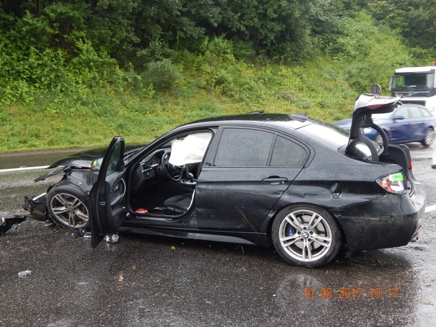 Am Donnerstag, den 10.08.2017, gegen 18:52 Uhr, kam es auf der BAB 3, zwischen dem Dernbacher Dreieck und der Anschlussstelle Montabaur zu einem Verkehrunfall, als der Fahrer eines BMW bei regnerischer Witterung in Folge nicht angepasster Fahrgeschwindigkeit in Aquaplaning geriet und zunächst in die linke Mittelschutzplanke einschlug. Der Fahrzeugführer, welcher sich auf der Überholspur bewegte, schleuderte anschließend quer über die Fahrbahn der BAB 3, wo er auf der mittleren Fahrspur mit voller Wucht seitlich gegen einen dort fahrenden niederländischen VW Golf prallte. In diesem saß ein Ehepaar mit seinen beiden Kindern. Der Fahrer des BMW, sowie die Beifahrerin im Golf mussten zur ambulanten Behandlung in ein nahegelegenes Krankenhaus verbracht werden. Die beiden schwer beschädigten PKW mußten jeweils durch einen Abschleppdienst geborgen und abtransportiert werden. Es entstand ein Sachschaden von circa 35000.- Euro. Im Rahmen der Unfallaufnahme, bei welchem zwei Fahrstreifen gesperrt werden mussten, kam es zu einem Rückstau von mehreren kilometern Länge. Gegen 20:15 Uhr war der Stau abgeflossen.