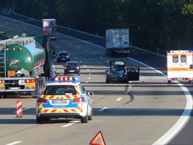 Am Samstag, den 19.08.2017, gegen 07:44 Uhr, kam es auf der BAB 3, km 93,2 in Fahrtrichtung Köln zu einem Verkehrsunfall zwischen zwei PKWs und einem LKW. Die Fahrerin eines niederländischen Audi A 6 verlor in Folge eines Sekundenschlafes auf der Rückfahrt aus dem Urlaub auf dem mittleren Fahrstreifen befindlich, die Kontrolle über ihr Kfz und touchierte zunächst seitlich am Außenspiegel einen rechts fahrenden PKW. Dieser bremste geitesgegenwärtig ab, um zurückzufallen. In der Folge fuhr der Audi A6 mit der rechten Fahrzeugfront gegen das hintere linke Fahrzeugende eines davor befindlichen Sattelzuges. Der Audi wurde hierbei schwer beschädigt und kam nach kurzer Zeit mit eingeklemmten rechten Vorderrad auf der mittleren Fahrspur zum Stehen. Bei dem Unfall wurden der Ehemann, sowie die beiden Kinder leichtverletzt. Sie wurden zur ambulanten Behandlung in ein nahegelegenes Krankenhaus verbracht. Der total beschädigte PKW mußte durch einen Abschleppdienst geborgen werden. Die verunreinigte Fahrbahn mußte mit einer Kehrmaschine der Autobahnmeisterei Montabaur gereinigt werden. Auch übernahm diese die Absicherung des Staus nach hinten, welcher eine Länge von circa 12km erreichte. Es entstand ein Sachschaden von circa 35000 Euro.