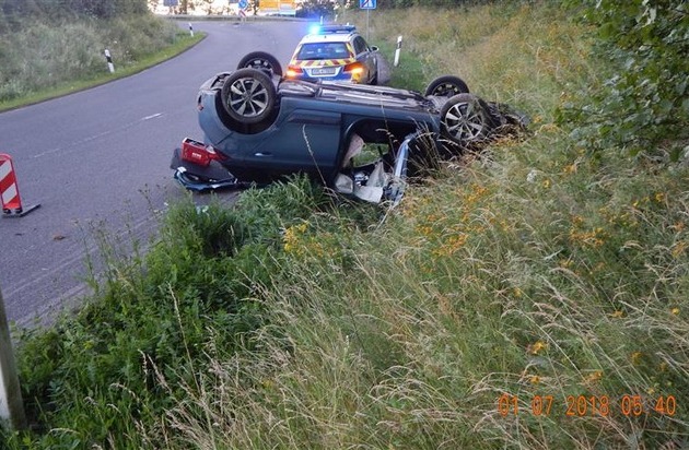 Am heutigen Morgen, gegen 04:55 Uhr, wurde hiesiger Dienststelle durch Verkehrsteilnehmer mitgeteilt, dass an der Anschlussstelle Neustadt/Wied, BAB 3, Fahrtrichtung Köln, ein Pkw verunfallt auf dem Dach liegen würde. Personen seien keine mehr vor Ort. Durch die eingesetzten Beamten wurde zunächst die Unfallstelle gesichert und im Anschluss nach dem verantwortlichen Fahrzeugführer gefahndet. Durch Zeugenhinweise konnte kurz darauf ein junger Mann im Nahbereich festgestellt werden. Diesem konnte der Pkw auch zugeordnet werden, die Fahrereigenschaft wurde dennoch bestritten. Der Mann stand unter Alkoholeinwirkung, ein Test ergab einen Wert von 1,08 Promille. Ihm wurde in der Folge eine Blutprobe entnommen, seine Fahrerlaubnis wurde eingezogen. Es wird darum gebeten, dass sich Zeugen melden, welche den Unfallhergang beobachtet haben und weitere sachdienliche Hinweise geben können. Hinweise bitte an die Polizeiautobahnstation Montabaur, 02602-93270.