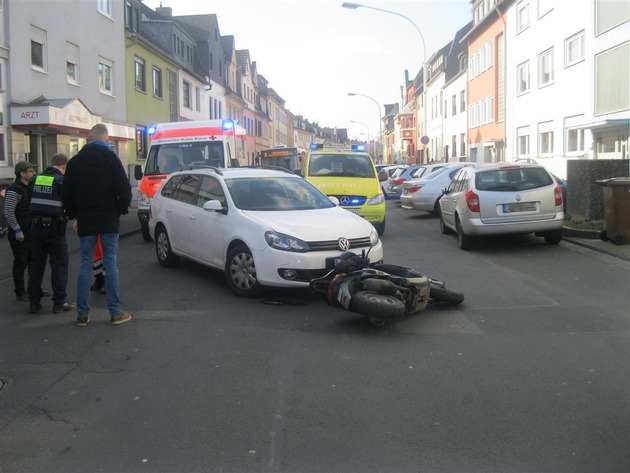 Am Montag, 14.3.2016, wurde der Polizei gegen 09.25 Uhr ein Verkehrsunfall im Brenderweg in Koblenz gemeldet. Hier bog ein Pkw-Fahrer, der von der Balduinbrücke in Richtung Herberichstraße unterwegs war, nach links in eine Einfahrt ab und übersah offensichtlich den entgegenkommenden Rollerfahrer. Bei der Kollision kam der Zweiradfahrer zu Fall und zog sich mehrere Prellungen zu. An den Fahrzeugen entstand ein Schaden von rund 500 Euro.