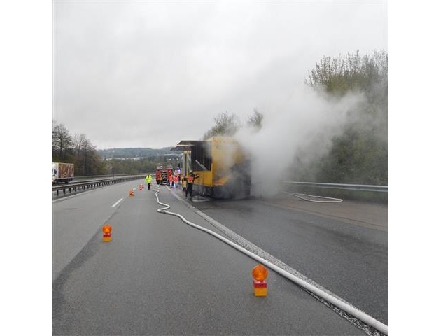 Am Sonntag, 01.05.2016, gegen 06:53 Uhr fing ein Sattelauflieger aus dem Raum Hanau auf der BAB 48, in der Gemarkung Höhr-Grenzhausen, in Fahrtrichtung Frankfurt, an zu brennen. Ursächlich dürfte nach derzeitigen Ermittlungen ein technischen Defekts an der Bremsanlage sein. Der 43jährige Lkw-Fahrer, welcher nicht verletzt wurde, konnte das Fahrzeug noch auf die Standspur lenken. Der mit Rennreifen beladene Sattelauflieger wurde durch die FFW Höhr-Grenzhausen gelöscht. Es entstand ein Sachschaden von ca. 50.000 Euro. Die rechte Fahrspur wurde für die Bergungsarbeiten mehrere Stunden gesperrt.