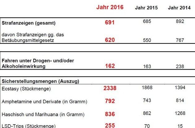 Die Mengen an sichergestellten Ecstasy hat seit 2014 in Folge zugenommen, von 1394 Stück 2014, über 1868 Stück 2015 auf nunmehr 2338 Stück. Ursächlich hierfür sind einige Sicherstellungen größerer zum Verkauf auf der Nature One bestimmt gewesener Einzelmengen. Die Mengen an beschlagnahmtem Amphetamin, Haschisch und Marihuana bewegen sich in etwa auf dem Niveau des Vorjahres.