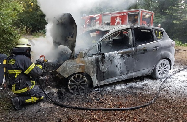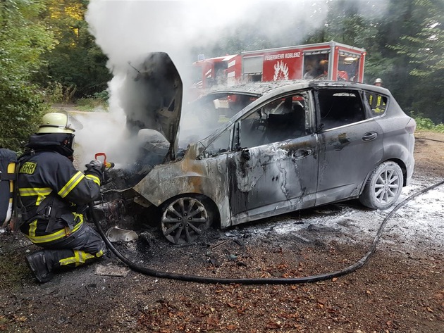 Feuerwehr und Polizei wurden am frühen Dienstagabend (13. September 2016) alarmiert, da mehrere Personen Rauch aus dem Koblenzer Stadtwald aufsteigen sahen. Schnell konnte die Rauchentwicklung im Bereich "Rittersturz" lokalisiert werden. Auf einem dortigen Parkplatz unterhalb des Waldspielplatzes stand bei Eintreffen der Rettungskräfte ein Pkw in Flammen. Die Feuerwehr löschte den zunächst im vorderen Bereich brennenden Ford C-Max.