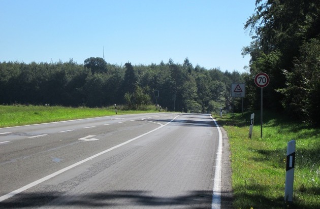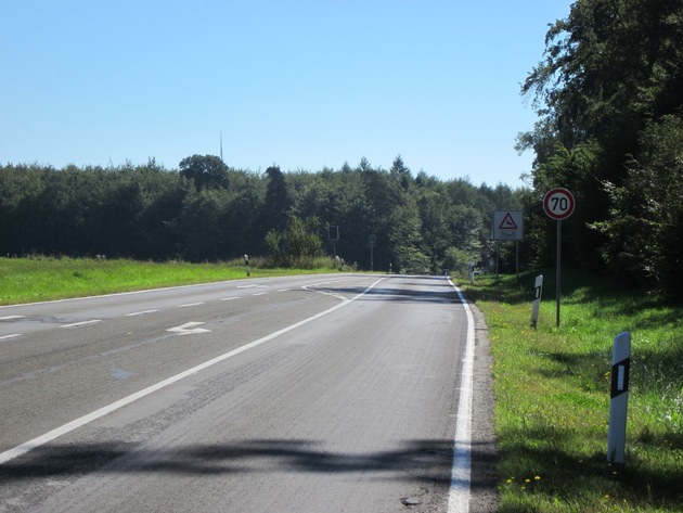 Zu der Örtlichkeit ist zu sagen, dass sich an der Stelle die geschwindigkeitsbedingten Verkehrsunfälle mit schweren Personenschäden häuften. Neben den schweren Verkehrsunfällen ereigneten sich noch zahlreiche Unfälle mit weniger schwerwiegenden Folgen. Das beigefügte Lichtbild zeigt die relativ wenig befahrene Strecke, die in Kurven durch ein Waldstück führt. Hinzu kommt, dass die Straße bereits etwas "in die Jahre" gekommen ist und nicht mehr den besten Ausbauzustand aufweist. Daher ist es umso wichtiger folgende Empfehlung, hier wie auch andernorts, zu beachten: