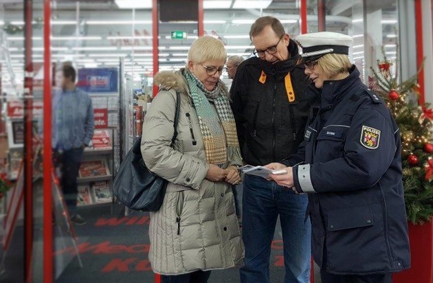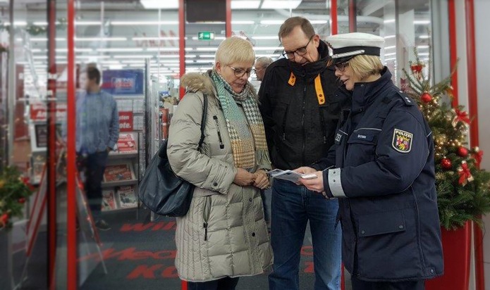 Im Rahmen der "Aktion gegen Taschendiebstahl" waren Beamtinnen und Beamte der Polizeiinspektion Koblenz 2 am vergangenen Samstag, 03.12.2016, an Einkaufsmärkten im Gewerbepark in Koblenz unterwegs, um die zahlreichen Kunden auf die Vorgehensweisen von Trick- und Taschendieben hinzuweisen. Eine Präventionsmaßnahme, die bei Bevölkerung auf positive Resonanz stieß. Tipps zum Schutz vor Taschendieben finden Sie unter: www.polizei-beratung.de