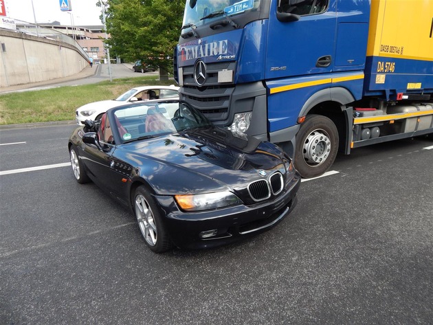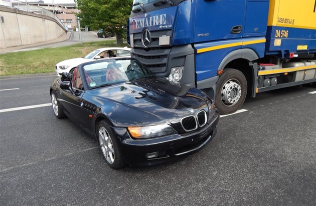 Am Dienstag, 04.07.2017 kam es gegen 16.28 Uhr zu einem Verkehrsunfall auf dem Moselring in Koblenz, bei dem eine Person leicht verletzt wurde, Sachschaden von rund 7500 Euro entstand und bis 17.15 Uhr für erhebliche Verkehrsbeeinträchtigungen im Berufsverkehr sorgte. Die drei Beteiligten waren auf der mehrspurigen B 9 in Richtung Europabrücke/Bonn unterwegs. Rechts ein BMW, in der Mitte ein Lkw und links ein Peugeot. Die BMW-Fahrerin zog kurz vor dem Lkw auf dessen Fahrspur und wurde von diesem am Heck ihres Fahrzeuges erfasst. Der BMW drehte sich um 90 Grad quer zur Fahrbahn. Mit der Fahrzeugfront ragte er in die linke Fahrspur, wo er mit der zu diesem Zeitpunkt nachfolgenden Peugeotfahrerin kollidierte und diese noch nach links in die Leitplanken drückte. Dessen Fahrerin wurde bei dem Unfall leicht verletzt. Der Peugeot musste abgeschleppt werden.