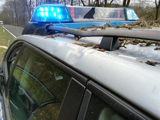 Am Donnerstag, 18.01.2018, 12.10 Uhr, wurden Beamte der Polizeiwache Wissen zu einer Verkehrsbeeinträchtigung durch Windbruch auf der B 62 gerufen. Während der Absicherung in der Gemarkung Hövels schlug unmittelbar hinter dem Streifenwagen, in dem sich ein Beamter befand, ein umgestürzter Baum auf. Der Pkw wurde von der Baumkrone vollständig getroffen und darunter begraben. Der im Fahrzeug befindliche Beamte blieb unverletzt und konnte sich eigenständig aus dem Fahrzeug befreien. Am Streifenwagen entstand erheblicher Sachschaden.