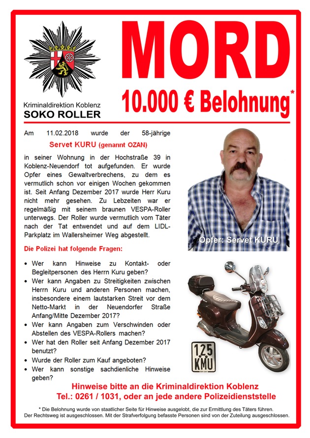 POL-PPKO: Koblenz: Tötungsdelikt in Koblenz - Kripo richtet Soko "Roller" ein