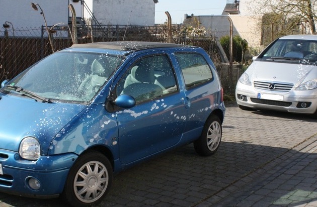 In der Nacht von Dienstag auf Mittwoch, 18.04.2018, wurden im Koblenzer Stadtteil Rübenach zwei Pkw mit einer Chemikalie besprüht und erheblich beschädigt. Diese, ein Renault Twingo und ein A-Klasse Mercedes, waren dort zwischen 18.00 und 09.00 Uhr in der Hollerstraße geparkt. Da sich an beiden Fahrzeugen der Lack vollständig vom Blech abgelöst hatte, ist eine Komplettlackierung an beiden Fahrzeugen erforderlich. Somit liegt die Schadenshöhe bei rund 6000 Euro. Hinweise bitte an die Polizeiinspektion Koblenz 2, Telefon. 0261-1032911.