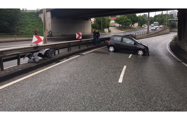 Ein Verkehrsunfall am Freitag, 15.06.2018, 07.37 Uhr im "Tieftrog" der B9 in Koblenz führte zu erheblichen Beeinträchtigungen des morgendlichen Berufsverkehrs. Die Fahrerin eines Renault Twingo, die aus Richtung Boppard kommend in Richtung Europabrücke unterwegs war, verlor auf der regennassen Fahrbahn die Gewalt über ihr Fahrzeug, rutschte in die Leitplanke, drehte sich um die eigene Achse und kam quer zur Fahrbahn zum Stillstand. Die Fahrerin wurde bei dem Unfall leicht verletzt. Bedingt durch die Unfallaufnahme und Bergungsmaßnahmen kam es zu erheblichen Verkehrsstörungen bis 09.00 Uhr.
