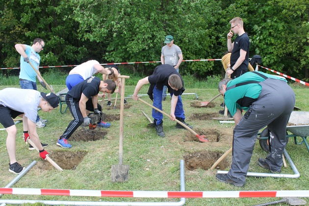 Bei idealen Wetterbedingungen hat an der Hochschule der Polizei auf dem Campus Hahn der Bau eines Calisthenics-Parcours begonnen. Über 30 freiwillige Helferinnen und Helfer waren bei den Aufbauarbeiten dabei. Es ist ein gemeinsames Projekt des Freundeskreises der Hochschule der Polizei und des 14. Bachelorstudiengangs, der im Oktober vergangenen Jahres das Studium am Campus Hahn begonnen hat. Hinter Calisthenics steckt die Idee der Verlagerung des Krafttrainings und Muskelaufbaus nach draußen in die Natur. Krafttraining im Outdoor Gym trifft den Zeitgeist der heutigen Generation. Schon in ein paar Wochen heißt es dann "Raus aus dem Haus und ran an die Barren". Beim Einsatz am Samstag standen dagegen erst einmal Schaufel und Hacke im Vordergrund. "Der Anfang ist gemacht", freut sich der Vorsitzende des Freundeskreises, Ernfried Groh, der neben dem Direktor der Hochschule, Friedel Durben und einigen Mitarbeitern auch etwa 30 freiwillige Studierende im Stadion begrüßen konnte. Nach zwei weiteren Arbeitseinsätzen soll die Anlage bis Ende des Monats Juni fertiggestellt sein. Der nächste Arbeitseinsatz ist schon für den 11. Juni 2016 geplant. Mit einer Länge von über 25 Metern und vielen unterschiedlichen Geräten soll der Calisthenics-Parcours später seinen Benutzern einiges abverlangen und wird das sportliche Angebot am Campus Hahn um eine weitere Attraktion bereichern.