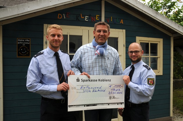 Studierende von der Hochschule der Polizei spenden 1000 Euro für die Villa Kunterbunt in Trier. Helge Herrmann und Lukas Kurz übergeben die Summe an den Leiter Dr. Christoph Block.