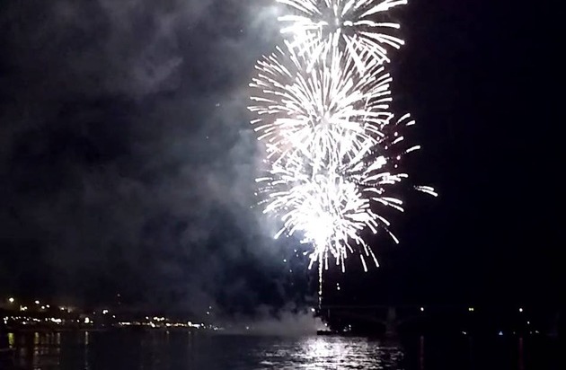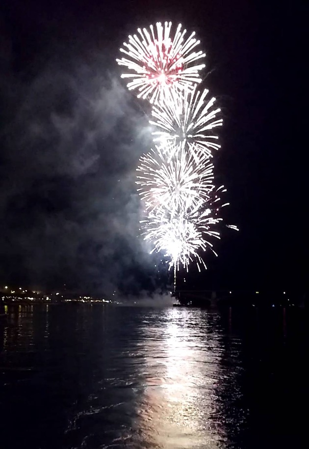 Zwischenzeitlich ist die Schifffahrt gesperrt, die Schiffspontons an und der LKW auf der Theodor-Heuss-Brücke mit den Feuerwerkern in Position. Nun zündet um 22.45 Uhr das großartige Höhenfeuerwerk, parallel begleitet von emotionaler und Spannung aufbauender Musik. Der Rhein brennt. Eine halbe Stunde Genuß pur mit grandiosem Finale. Alle Schiffsgäste und auch die zahlreichen Sportboote, die sich das Spektakel nicht entgehen lassen, kommen voll auf ihre Kosten.