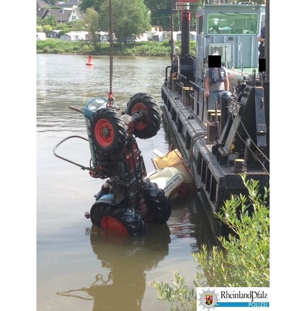 Bereits am Mittwoch, dem 06.06.2018 rollte ein Traktor im Bereich der Ortslage Pünderich in die Mosel. Grund war laut Aussage des Besitzers ein unbeabsichtigtes Lösen der Handbremse. Ein angehängter leerer Spritzbehälter verhinderte, dass der Traktor mit Anhänger komplett unterging. Das Fahrzeug konnte durch zwei unmittelbar in der Nähe befindliche Arbeitsboote des WSA Koblenz gesichert und anschließend mit Hilfe eines Tauchers von diesen geborgen werden. Während der Bergung wurde eine geringe Menge Betriebs- und Schmierstoffe freigesetzt. Die Schifffahrt wurde kurzfristig gesperrt.