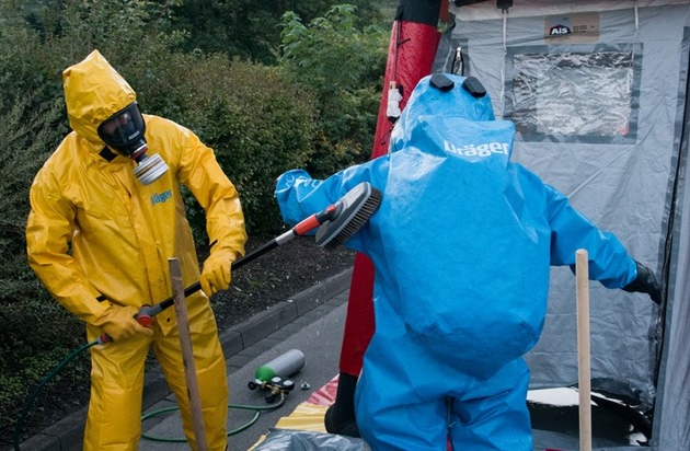 Eine Übung der Feuerwehr Lennestadt fand am vergangenen Freitag auf dem Gelände der Firma REMONDIS Industrie Service in Lennestadt Maumke statt. Diese Übung diente unter anderem dazu, die vorhandenen Lösch und Sicherheitseinrichtungen auf dem Firmengelände zu testen. Das Objekt verfügt u.a. über drei Rohre, die unter der Bahnlinie verlegt sind, damit im Einsatzfall unabhängig vom Bahnverkehr der zügige Aufbau einer ausreichenden Wasserversorgung möglich ist. Weiterhin sollte die Vorgehensweise für bestimmte Schadenereignisse geübt werden. Seit Jahren bestehen gute Kontakte zur Firma, welche dazu genutzt werden, auch mal außergewöhnliche Einsatzlagen wie den Umgang mit Gefahrstoffen zu üben. Neben dem Aufbau der Wasserversorgung wurde das Abdichten von verschiedenen Leckagen geübt, was mit Chemikalienschutzanzügen (CSA) erfolgen muss. Bei diesen CSA-Anzügen ist der Träger komplett von seiner Umwelt isoliert, so dass er unabhängig im Gefahrenbereich arbeiten kann. Zur Atemluftversorgung hat der CSA-Träger einen Pressluftatmer auf dem Rücken. Die Einsatzzeit ist aufgrund der hohen körperlichen wie psychischen Belastung auf 20 bis maximal 25 Minuten begrenzt. Hinzu kommt noch die Zeit, die für das "auspacken" des Trägers benötigt wird. Nach der Übung bestand für die Kameradinnen und Kameraden Gelegenheit, das gesamte Gelände von REMONDIS noch mal zu besichtigen. An der Übung nahmen die Löschgruppen Maumke, Meggen, Altenhundem, Halberbracht und der Gerätewagen Gefahrgut aus Grevenbrück teil.