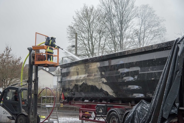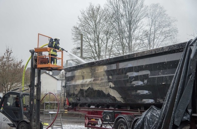 Am heutigen Nachmittag gegen 13:45 Uhr geriet der Auflieger eines Gefahrgut-LKW´s auf dem Gelände eines Entsorgungsunternehmens in Lennestadt Maumke in Brand. Der Fahrer reagierte geistesgegenwärtig, fuhr das Fahrzeug auf eine freie Fläche, kuppelte den Auflieger von der Zugmaschine ab und fuhr diese beiseite. Anschließend warnte er seine Kollegen auf dem Betriebsgelände und alarmierte die Feuerwehr. Die Feuerwehr Lennestadt bekämpfte den mit ölverschmierten Betriebsmitteln beladenen Auflieger zunächst mit Wasser, im weiteren Verlauf wurden zwei Schaummittelrohre unter Atemschutz eingesetzt. Der Auflieger war nur etwas zu einem Viertel beladen. Nachdem das Feuer unter Kontrolle war wurde der Auflieger mit einem Bagger leer geräumt, um alle Glutnester abzulöschen und ein Wiederaufflammen der Ladung zu verhindern. Verletzte wurde niemand, die bei Ausbruch des Feuers unmittelbar in der Nähe des LKW´s befindlichen Mitarbeiter wurden vorsorglich vom Notarzt untersucht. Die Feuerwehr Lennestadt war mit den Löschgruppen Maumke, Meggen, Grevenbrück und 45 Kameraden im Einsatz. Zudem waren Polizei, Rettungswagen und Notarzt vor Ort. Über die Schadenhöhung und Brandursache liegen keine Informationen vor. Die Bundesstraße wurde während der Löscharbeiten vorübergehend gesperrt.