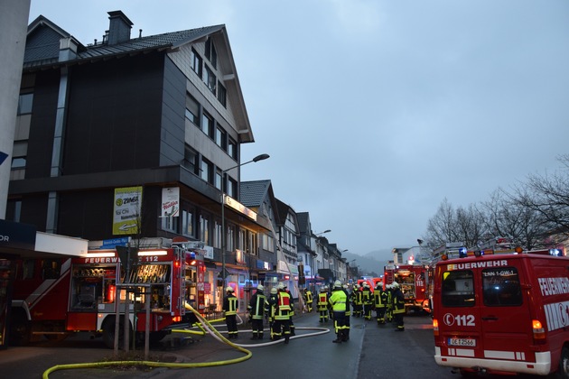 Die Feuerwehr Lennestadt wurde am frühen Mittwochmorgen gegen 06:15 Uhr zu einem Feuer in einem Wohn- und Geschäftshaus in Lennestadt-Altenhundem alarmiert. Im Keller eines mehrstöckigen Wohn- und Geschäftshaus war es aus bisher ungeklärter Ursache zu einem Feuer gekommen. Aufgrund der starken Rauchentwicklung war das Treppenhaus derart verqualmt, dass eine Person von der Feuerwehr mit der Drehleiter aus dem 2. Obergeschoss gerettet werden musste. Sie hatte sich am Fenster bemerkbar gemacht. Ein zusätzlicher Trupp rettete unter Atemschutz eine weitere Person über eine Steckleiter aus dem 1. Obergeschoss. Eine weitere Person konnte das Gebäude vor Eintreffen der Feuerwehr eigenständig verlassen. Die drei Personen wurden an den Rettungsdienst übergeben und in umliegende Krankenhäuser transportiert. Der im Keller lokalisierte Brand konnte durch die Feuerwehr durch einen Trupp unter Atemschutz gelöscht werden. Grund für die starke Rauchentwicklung waren unter anderem im Keller gelagerte Reifen. Die Feuerwehr Lennestadt war mit den Löschgruppen Altenhundem, Kickenbach, Maumke, Meggen, Saalhausen und 50 Einsatzkräften im Einsatz. Ebenfalls vor Ort waren Markus Hamers, Leiter der Feuerwehr Lennestadt, Mario Fuhlen, stellvertretender Kreisbrandmeister des Kreises Olpe, der Bürgermeister der Stadt Lennestadt, Stefan Hundt und die Polizei. Der Rettungsdienst des Kreises Olpe war mit 3 Rettungswagen und einem Notarzt im Einsatz. Während der Löscharbeiten war die L 517 in beide Richtungen voll gesperrt. Über die Schadenshöhe liegt der Feuerwehr Lennestadt keine Information vor.