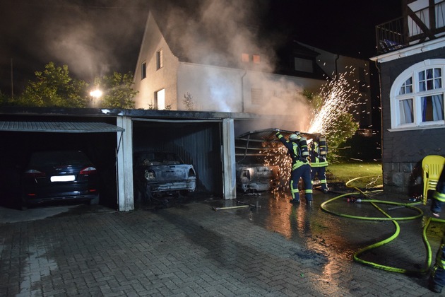 Zu einem Garagenbrand in einem Wohngebiet wurden am späten Mittwochabend gegen 23:00 Uhr die Löschgruppe Grevenbrück der Feuerwehr Lennestadt und der Rettungsdienst des Kreises Olpe alarmiert. Bereits vor Eintreffen der ersten Einsatzkräfte wurde, aufgrund mehrerer Notrufe und der direkten Nähe zu zwei Wohnhäusern, das Alarmstichwort durch die Kreisleitstelle Olpe erhöht. Dadurch wurden umgehend weitere Einsatzkräfte der Löschgruppen aus Bilstein, Elspe und die Drehleiter der Löschgruppe Meggen zur Einsatzstelle alarmiert. Schon auf der Anfahrt war ein deutlicher Feuerschein zu sehen. Beim Eintreffen der Feuerwehr brannten im Hinterhof eines Mehrfamilienhauses eine Sitzecke sowie eine Doppelgarage mit zwei PKW und einem Quad in voller Ausdehnung. Durch die enorme Hitzestrahlung drohte das Feuer auf zwei benachbarte Wohnhäuser überzugreifen. Brennende Teile der Garage waren bereits aus eines der Häuser gestürzt, von dem anderen Haus schmolzen Teile eines Vordaches und eine Hecke hatten bereits Feuer gefangen. Die Bewohner der beiden Häuser hatten ihre Wohnungen bereits verlassen, ein Anwohner unternahm mit einem Gartenschlauch erste Löschversuche. Um eine Ausbreitung zu verhindern konzentrierte man sich zunächst mit einem Atemschutztrupp auf das Abkühlen der Fassaden. Ein weiterer Atemschutztrupp ging parallel zur Brandbekämpfung der Garagen vor. Die Vermutung, dass sich noch Gasflaschen in der Garage befanden, bestätigte sich glücklicherweise nicht. In den betroffenen Garagen brannten mindestens zwei PKW und ein Quad vollständig aus. Ein dritter PKW wurde durch den Brand stark beschädigt. Durch den Einsatz von mehreren Atemschutztrupp mit C-Strahlrohren konnte ein vollständiges Übergreifen auf eine dritte Garage durch die Feuerwehr ebenfalls verhindert werden. Im gesamten Einsatzverlauf wurden insgesamt vier Trupps unter Atemschutz eingesetzt. Die Feuerwehr Lennestadt war mit 11 Fahrzeugen und ca. 55 Kameraden im Einsatz. Des Weiteren waren die Polizei und der Rettungsdienst des Kreises Olpe mit einem Rettungswagen und der stellvertretende Leiter der Feuerwehr Lennestadt, Andreas Schürmann vor Ort. Über die Brandursache und Schadenhöhe liegen der Feuerwehr Lennestadt keine Informationen vor.