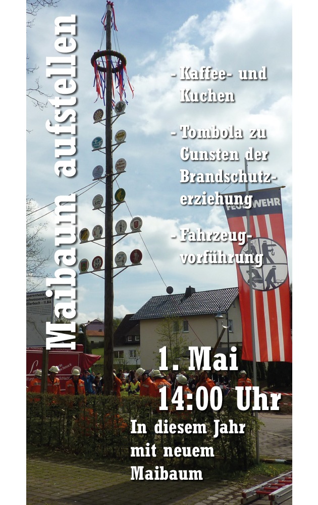 Los geht es an diesem Sonntag, den 1.Mai, ab 14.00 Uhr. Alle Bürgerinnen und Bürger sind herzlich eingeladen gemeinsam mit den Vereinen den Mai zu begrüßen.