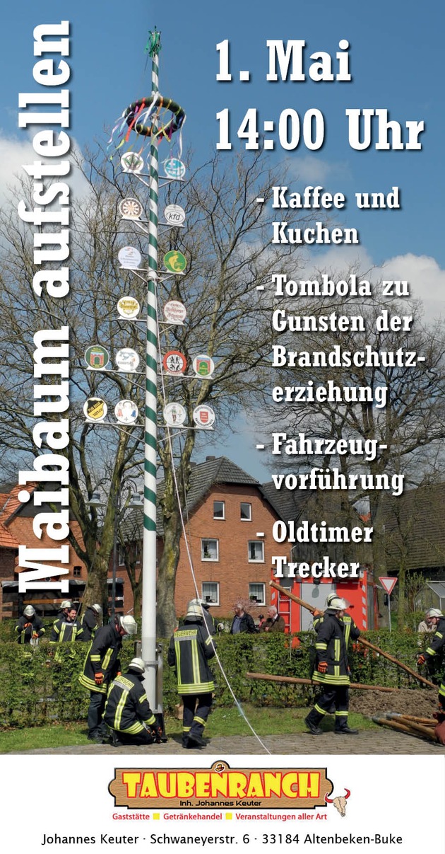 Los geht es am Montag, den 1.Mai, ab 14.00 Uhr. Alle Bürgerinnen und Bürger sind herzlich eingeladen gemeinsam mit den Vereinen den Mai zu begrüßen.