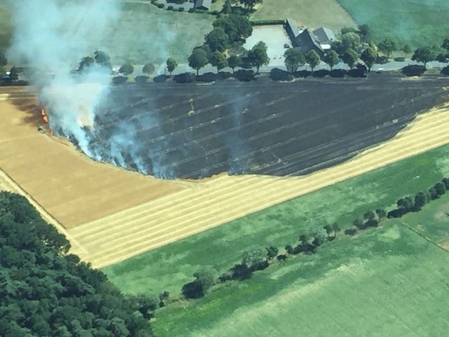 Am gestrigen Tag alarmierte um 15:30 Uhr die Leitstelle einen Löschzug der Feuerwehr Schermbeck für einen ca. 5 m² Feldbrand. Das Feuer konnte sich sehr schnell ausbreiten, sodass die ersteintreffenden Kräfte sofort die anderen Schermbecker Löschzüge (LZ Altschermbeck und LZ Gahlen) sowie ein Tanklöschfahrzeug der Feuerwehr Wesel nachalarmieren ließen. Letzendlich brannten ca. 5,5 ha. Aufgrund der starken Rauchentwicklung über der Weseler Str. (B 58) und aus Sicherheitsgründen für die eingesetzten Kräfte wurde die B 58 durch die Polizeibeamten in beide Richtungen gesperrt. Ein helfender Landwirt zog mit seinem Trecker eine Schneise um das Feuer, damit sich das Feuer nicht weiter ausbreiten konnte. Mit C-Rohren wurde das brennende Getreidefeld sodann gelöscht.