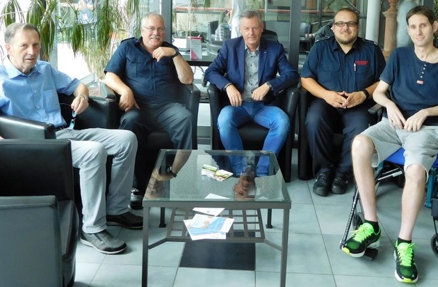 Der am 19.11.2017 während eines Einsatzes des Löschzuges Lohmar** schwer verletzte Feuerwehrmann ist nach sieben Monaten auf dem Weg der Besserung, wovon sich auch der Lohmarer Bürgermeister Horst Krybus bei einem Besuch überzeugen konnte.