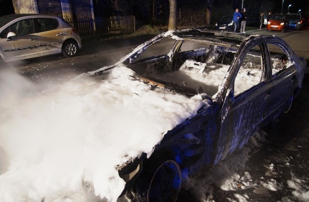 Zwei Atemschutztrupps bekämpften die Flammen mit einer Schaumpistole und einem Strahlrohr, dies zeigte schnell Wirkung. Da in dem PKW augenscheinlich auch Leichtmetalle in Brand geraten waren, forderte der Einsatzleiter zunächst den Rüstwagen nach. Auf dem Rüstwagen befindet sich Metallbrand-Pulver, mit diesem lassen sich die mit hoher Temperatur verbrennenden Leichtmetalle wirkungsvoll ablöschen. Zum Einsatz kam das Pulver allerdings nicht mehr, da der eingesetzte Löschschaum und das Fluten des PKWs nach einiger Zeit Wirkung zeigten. Die Einsatzkräfte kontrollierten eine angrenzende Böschung und ein Stromhaus, welche sich ebenfalls in Windrichtung befanden, man befürchtete auch hier einen Schaden durch Funkenflug und Wärmestrahlung. Glücklicherweise war dies nicht der Fall.