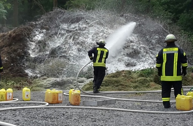 Auf dem kommunalen Lagerplatz für Grünabfall am Galbusch brannte heute ein Teil des abgelegten Grünschnittes. Die Feuerwehr rückte daraufhin mit den Löschzügen der Wache und Mitte an, um das Feuer abzulöschen. Die ausgerückten 15 Kameraden benutzten Schaummittel als Netzmittel, damit das Wasser besser in die Zwischenräume gelangt. Ausserdem wurde ein Bagger des MBB angefordert, der den Haufen auseinandergezogen hat, um die Löscharbeiten effektiver zu gestalten. Warum das Feuer ausgebrochen ist, ist unklar.
