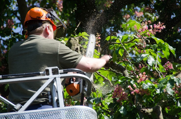 Anwohner des Schattweg hatten am heutigen Mittwoch einen abgeknickten Ast gemeldet, der bereits über die Straße und eine Freileitung hing. Da die Stabilität nicht mehr gegeben war und somit Gefahr im Verzug war, wurde die Feuerwehr mit der Drehleiter gerufen, um die Mitarbeiter des Baubetriebshofes zu unterstützen. Der Ast wurde entfernt und die Gefahr beseitigt.