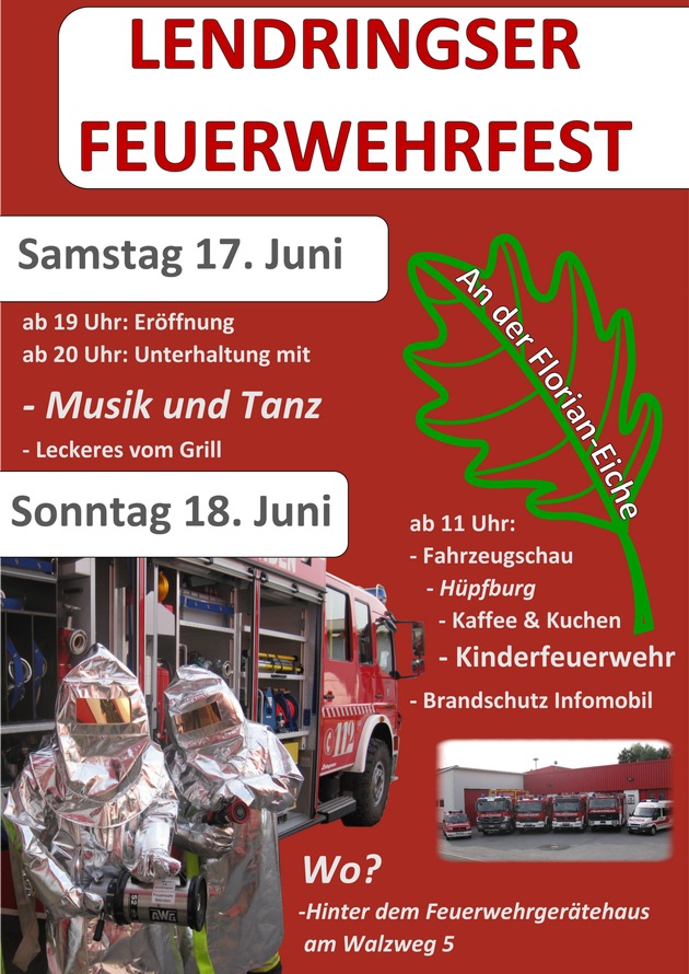Die Löschgruppen Lendringsen der Freiwilligen Feuerwehr Menden feiern am Samstag, 17.06.2015 und am Sonntag, 18.06.2015 mit Mendens Bürgerinnen und Bürgern ein großes Feuerwehr- und Familienfest. Die Lendringser Wehr lädt alle Interessenten am Samstag ab 19 Uhr in ihr Gerätehaus ein. An der Florian- Eiche, auf dem Platz hinter dem Gerätehaus, wird sich um das leibliche Wohl durch die Wehrleute aus Lendringsen gekümmert. Der Sonntag ist dann ab 11 Uhr der Fami-lientag beim Feuerwehrfest. "Unser Ziel ist es, den Familien einen tollen Tag zu bereiten. Wir wollen für unsere Arbeit begeistern", so Löschzugführer Michael Schelp, der sich für das Feu-erwehrfest eine große Resonanz wünscht. Die Kinder können sich am Sonntag auf ein Spiel-paradies mit großer Hüpfburg freuen. Außerdem wird eine Übung der Kinderfeuerwehr statt-finden. Die erwachsenen Besucher können sich über die Arbeit der Freiwilligen Feuerwehr informieren. Ihre Feuerwehr Lendringsen freut sich auf Sie und möglichen Nachwuchs für unsere Einsatz-abteilung!